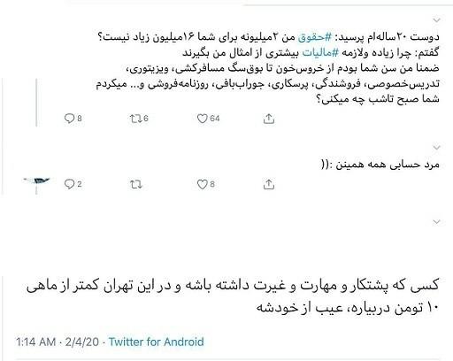 همین آقا در جواب واکنش به حقوق 16 میلیونیاش نوشته است:« اگر در تهران کمتر از ۱۰میلیون درآمد دارید؛ پشتکار و غیرت ندارید!”»