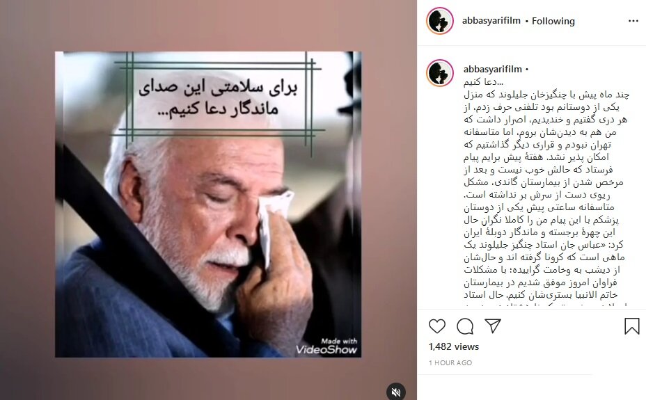 «چند ماه پیش با چنگیزخان جلیلوند که منزل یکی از دوستانم بود، تلفنی حرف زدم، از هر دری گفتیم و خندیدیم، اصرار داشت که من هم به دیدنشان بروم، اما متأسفانه تهران نبودم و قراری دیگر گذاشتیم که امکانپذیر نشد. هفته پیش برایم پیام فرستاد که حالش خوب نیست و بعد از مرخص شدن از بیمارستان گاندی، مشکل ریوی دست از سرش بر نداشته است. متاسفانه ساعتی پیش، یکی از دوستان پزشکم با این پیام، من را کاملا نگرانِ حال این چهره برجسته و ماندگار دوبله ایران کرد: عباس جان، استاد چنگیز جلیلوند یک ماهی است که کرونا گرفتهاند و حالشان از دیشب به وخامت گراییده؛ با مشکلات فراوان، امروز موفق شدیم در بیمارستان خاتمالانبیا بستریشان کنیم. حال استاد اصلا خوب نیست، کرونا هشتاد درصد ریه را درگیر کرده. باید برای سلامتی او دعا کنیم.»