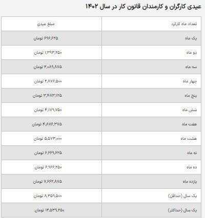 جدول زیر در بردارنده میزان دریافت عیدی برای کارگرانی که کمتر از یک سال سابقه کار را دارند.