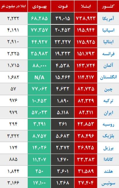 به طور کلی در جهان کشورهای آمریکا، اسپانیا، ایتالیا، فرانسه و آلمان رتبههای اول تا پنجم ابتلا به بیماری کووید۱۹ را به خود اختصاص میدهند.