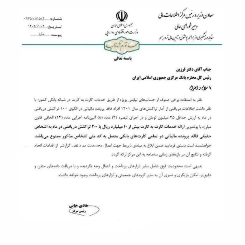 در مکاتبه هادی خانی، رییس اطلاع مالی کشور آمده است، نظر به استفاده برخی صنوف از حسابهای نیابتی بویژه از طریق خدمات کارت به کارت در شبکه بانکی کشور؛ با نظر داشت اطلاعات دریافتی از آمار تراکنشهای سال ۱۴۰۱ افراد فاقد پرونده مالیاتی در الگوی ۱۰۰ تراکنش دریافتی در ماه به ارزش حداقل ۳۵ میلیون تومان و در اجرای تبصره (۳) ماده (۸) آئین نامه اجرایی ماده (۱۴) الحاقی قانون مبارزه با پولشویی ارائه خدمات کارت به کارت بیش از ۱۰ میلیارد ریال یا ۲۰۰ تراکنش دریافتی در ماه به اشخاص حقیقی فاقد پرونده مالیاتی در تمامی کارتهای بانکی متصل به کد ملی اشخاص مذکور ممنوع میباشد.