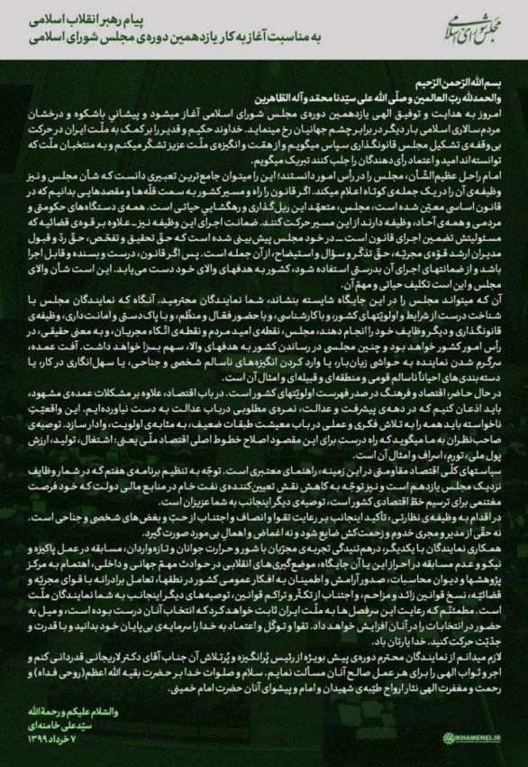 در این پیام که صبح امروز حجتالاسلام والمسلمین محمدیگلپایگانی آن را در افتتاحیه یازدهمین دوره مجلس شورای اسلامی قرائت کرد، رهبر انقلاب با ابراز خرسندی از آغاز دور جدید مجلس و رخ نمایاندن این پیشانیِ باشکوه و درخشان مردمسالاری اسلامی در برابر چشم جهانیان، از همت و انگیزه ملت برای تشکیل مجلس تشکر کردند و به منتخبان جدید تبریک گفتند.
