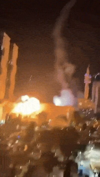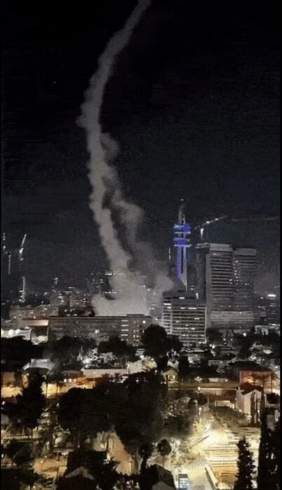 لحظه برخورد موشک بالستیک ایران به محدوده اردوگاه رابین واقع در تلآویو که آثار دود موجود پیش از برخورد نشان میدهد سامانههای دفاع هوایی اسرائیل در محدوده مسکونی مستقر شده و درحال فعالیت بودهاند