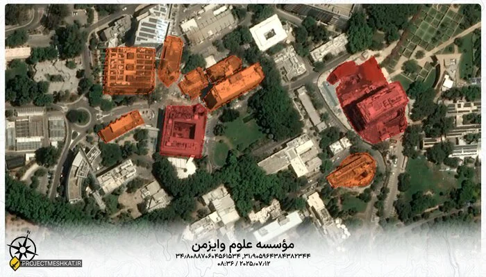 دو ساختمان در محوطه موسسه وایزمن که بهطور مستقیم هدف دو موشک بالستیک ایران قرار گرفته است (قرمز) که در اثر آن موج انفجار سبب وارد آمدن خساراتی در سطوح مختلف به ساختمانهای مجاور شده است (نارنجی).