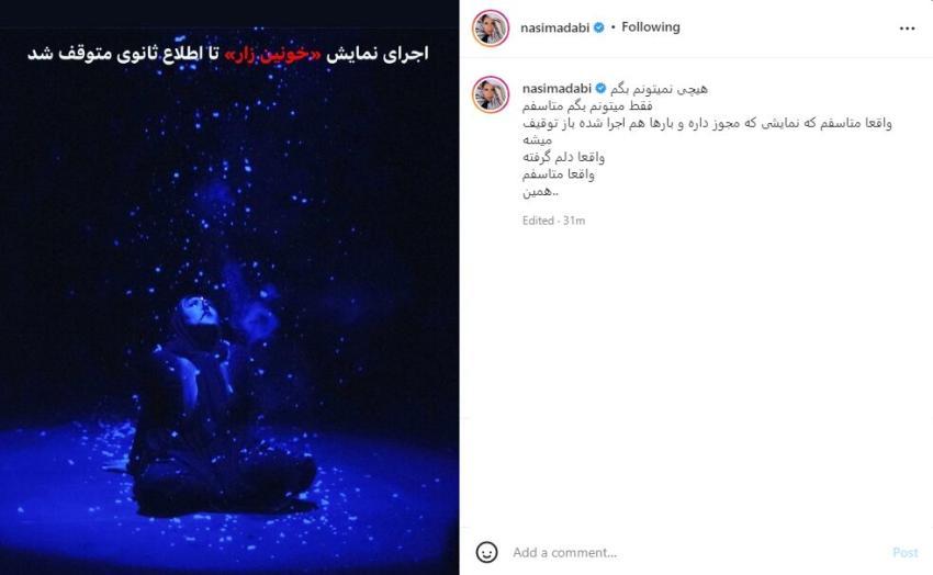 نسیم ادبی ضمن اعلام این خبر در صفحه اینستاگرامش، چنین نوشت: «هیچ چیزی نمی‌توانم بگویم. فقط می‌توانم بگویم متاسفم. واقعا متاسفم که نمایشی که مجوز دارد و بارها هم اجرا شده است باز توقیف می‌شود. واقعا دلم گرفته است. واقعا متاسفم. همین…»