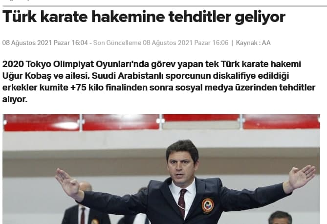 اوگور کوباش، تنها نماینده ترکیه در هیئت ژوری کاراته المپیک، بدشانس بود که این مسابقه را قضاوت کرد چرا که جنجالهای پیرامون آن دامنش را گرفت و حتی ماجرا به خانواده اش هم رسید. کوباش در گفتگویی که با تلویزیون ت ر ت ترکیه داشت، به این موضوع پرداخته و از تهدیدهای مجازی شدید کاربران سعودی به خود، همسر و دخترش پرده برداشت.