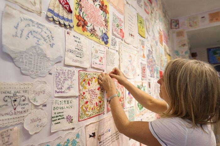 یک بانوی هنرمند آمریکایی نمایشگاهی از گلدوزی کنایه‌آمیز توئیت‌ها و ادعاهای جنجالی «دونالد ترامپ» رئیس‌جمهوری آمریکا برپا کرد.