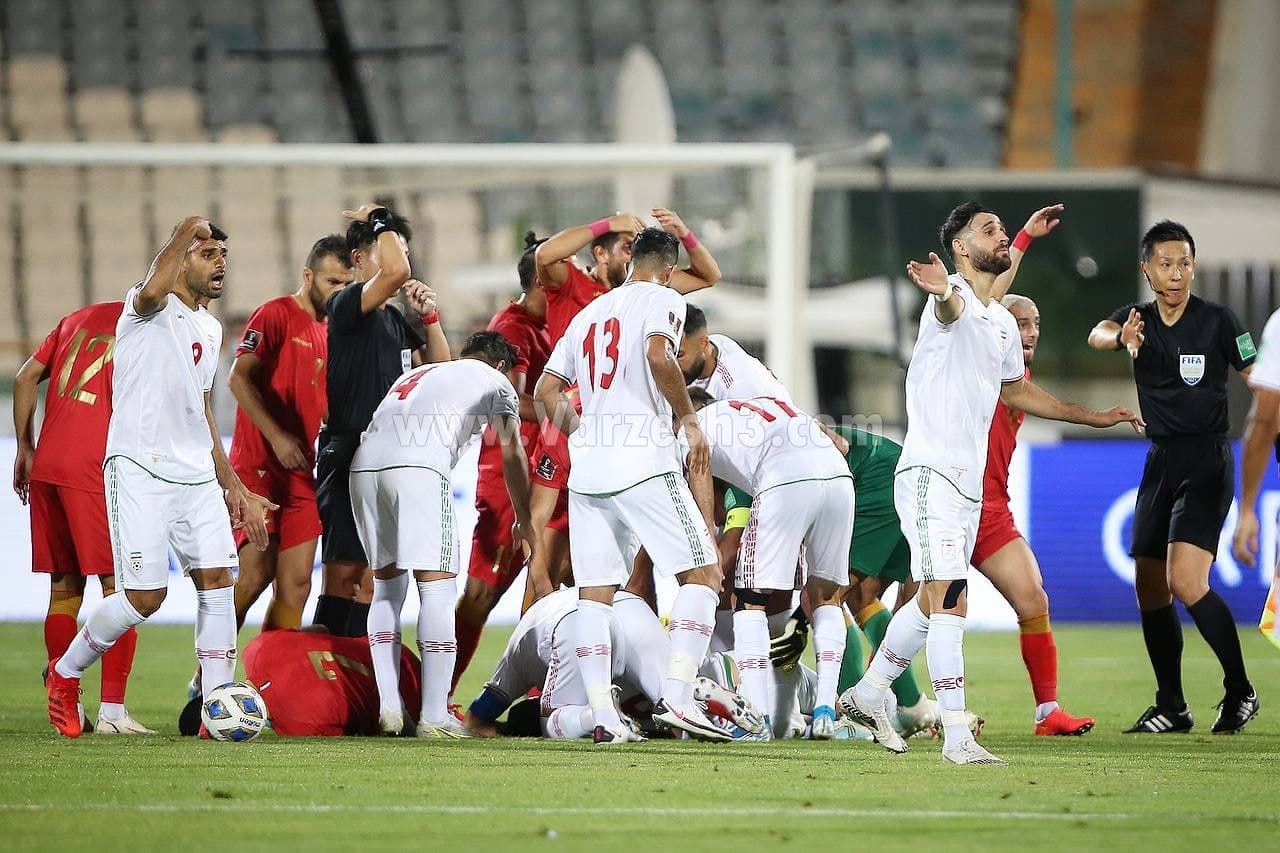 * با توجه به اینکه بازی بدون حضور تماشاگر برگزار می شود، یک پرچم بزرگ ایران بخش زیادی از سکوهای ورزشگاه آزادی را پوشانده است.