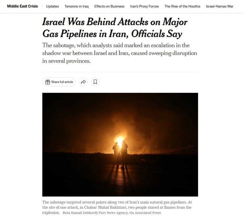 روزنامه نیویورک تایمز به نقل از “چند مقام غربی مطلع” مدعی شد دو انفجار خط لوله گاز در ایران، کار اسرائیل بود.