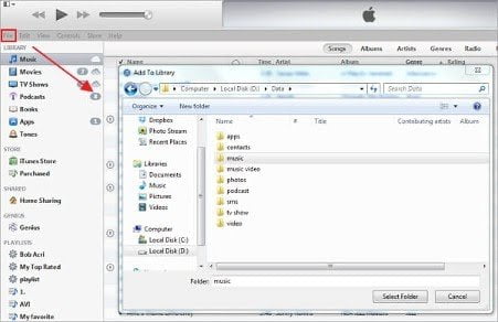 مرحله بعدی اضافه کردن محل فایل‌های انتقال یافته از دستگاه اندرویدی به رایانه است که کاربر برای انجام آن باید روی گزینه منو که در بالا و سمت چپ این نرم افزار قرار گرفته کلیک کند و سپس بخش Add Folder to Library را انتخاب کند.