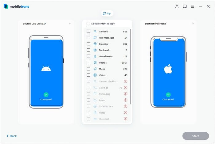 اکنون زمان اتصال دو گوشی مورد نظر به کامپیوتر از طریق کابل USB است؛ نرم افزار به محض اتصال دو گوشی به رایانه آن‌ها را شناسایی خواهد کرد و کاربران احتیاج به نصب درایور خاصی را ندارند. مرحله بعدی انتخاب گزینه Phone Transfer از منوی نشان داده شده به کاربر است.