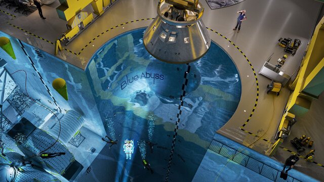 بزرگترین و عمیق‌ترین استخر سرپوشیده جهان موسوم به “Blue Abyss” که معادل ۱۷ استخر شنا در اندازه المپیک است، می‌تواند برای آموزش فضانوردان استفاده شود.