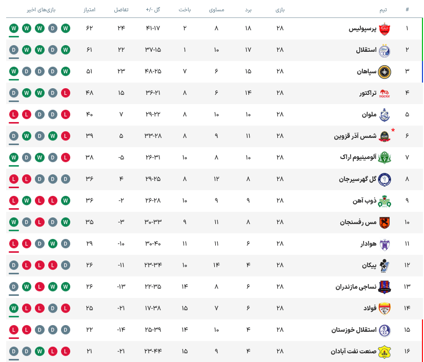 پرسپولیس تهران با یک امتیاز بیشتر در صدر جدول قرار دارد.
