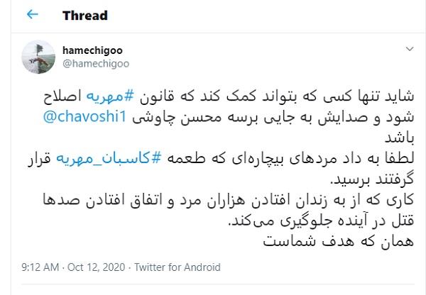 کاربر دیگری هم نوشته: شاید تنها کسی که بتواند کمک کند قانون مهریه اصلاح شود و صدایش به جایی برسه محسن چاوشی باشد. لطفا به داد مردهای بیچارهای که طعمه کاسبان مهریه قرار گرفتند برسید