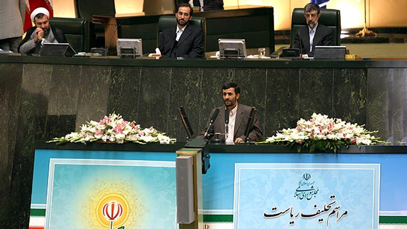 احمدی نژاد در سخنرانی مراسم تحلیف تاکید کرد: بهترین ژست دیپلماتیک، پایبندی به قوانین است. در کشور ما دمکراسی واقعی وجود دارد و قوا مستقل از یکدیگر هستند و اگر بپذیریم که قوه مجریه در کار مقننه دخالت کند، مفهومش دیکتاتوری است. لذا من حامی اجرای قانون هستم و از تمام ظرفیت قانون برای استیفای حق مردم استفاده خواهم کرد.