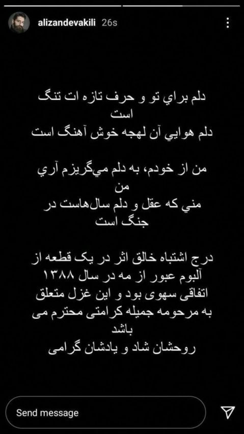 علی زند وکیلی در صفحه خود نوشته است: «دلم برای تو و شعر تازه‌‏ات تنگ است/ دلم هوایی آن لهجه خوش‌آهنگ است