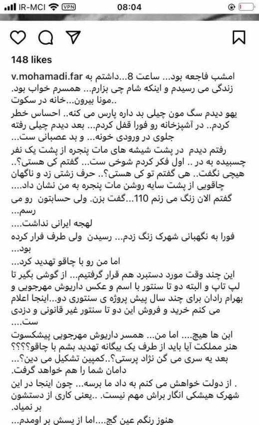 پست وحیده محمدی فر همسر داریوش مهرجویی در رابطه با حمله فردناشناس با چاقو در اطراف منزلشان، چند روز قبل از جنایت مشکین دشت